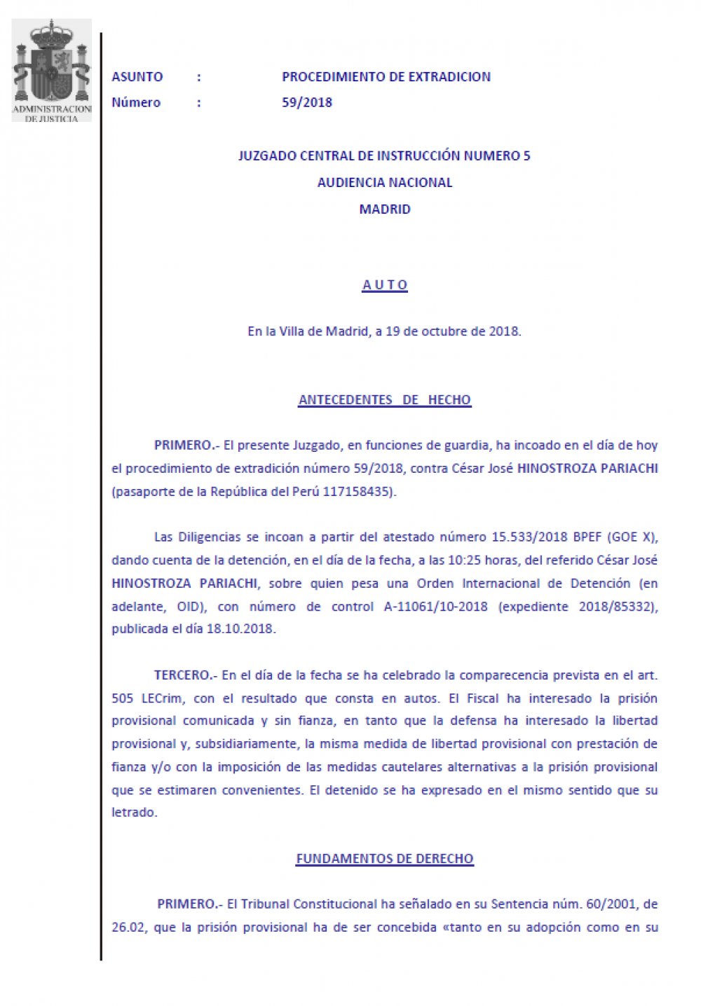 A partir de la 1:00 p. m. (hora peruana) de hoy, el juzgado central número 5, cuyo titular es el magistrado José de la Mata, tomará declaraciones a César Hinostroza para decidir sobre su situación personal, antes de que ser extraditado a Perú.