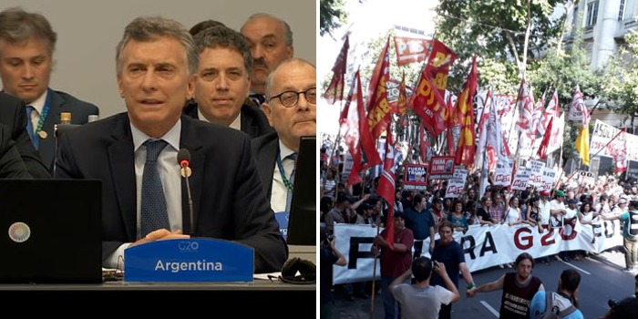 La Cumbre de líderes del G20 reunirá a grandes responsables de las estrategias de dominación de los pueblos y la naturaleza que tan nefastos efectos descargan sobre la política y economía argentina y del mundo entero. Repudiamos la presencia en nuestro país de Trump y demás líderes imperialistas, de los representantes de la banca internacional y las grandes transnacionales, el FMI, el Banco Mundial, la OCDE. Connotados enemigos de la Humanidad. Proclamamos, ¡¡¡Fuera el G20!!! y ¡¡¡Fuera el FMI!!!