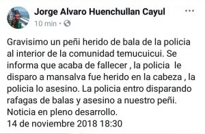 “Lo confirma la familia que acaba de fallecer, el peñi murió, la policía lo asesinó al interior de la comunidad y de ahí lo llevaron al consultorio, pero ya no pudieron hacer nada. Lo asesinaron, así de simple”, aseguró Huenchullán a Cooperativa.