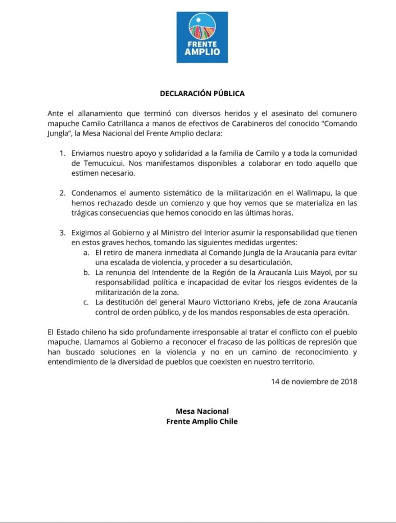 Desde el Frente Amplio también hubo reacciones mediante una declaración pública donde exigen la renuncia del intendente de La Araucanía, Luis Mayol, entre otras peticiones.