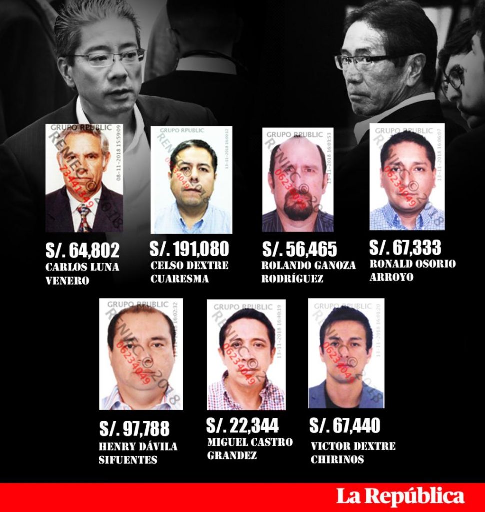 De acuerdo a lo que Fuerza Popular declaró a ONPE, Celso Dextre aportó 191,080 soles; Víctor Dextre 67,440 soles; Henry Dávila 97,788 soles; Rolando Ganoza 56,465 soles; Carlos Luna 64,802 soles; Ronald Osorio 67,333 soles y Miguel Castro 22,344 soles.