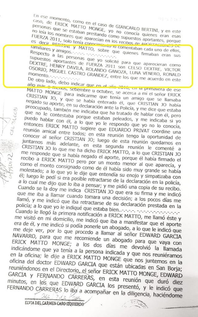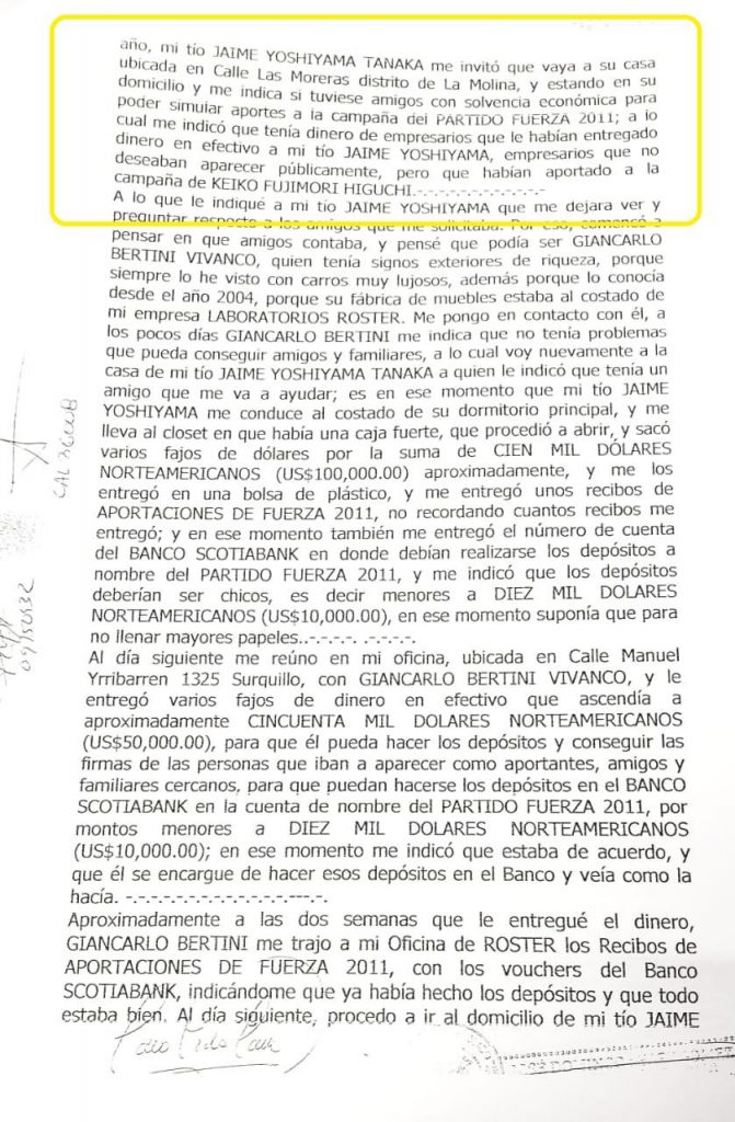 “Estando en su domicilio, me indica si tuviese amigos con solvencia económica para poder simular aportes a la campaña de Fuerza 2011, a lo que me indicó que tenía dinero de empresarios que le habían entregado dinero en efectivo a mi tío Jaime Yoshiyama, empresarios que no deseaban aparecer públicamente, pero que habían aportado a la campaña de Keiko Fujimori”.