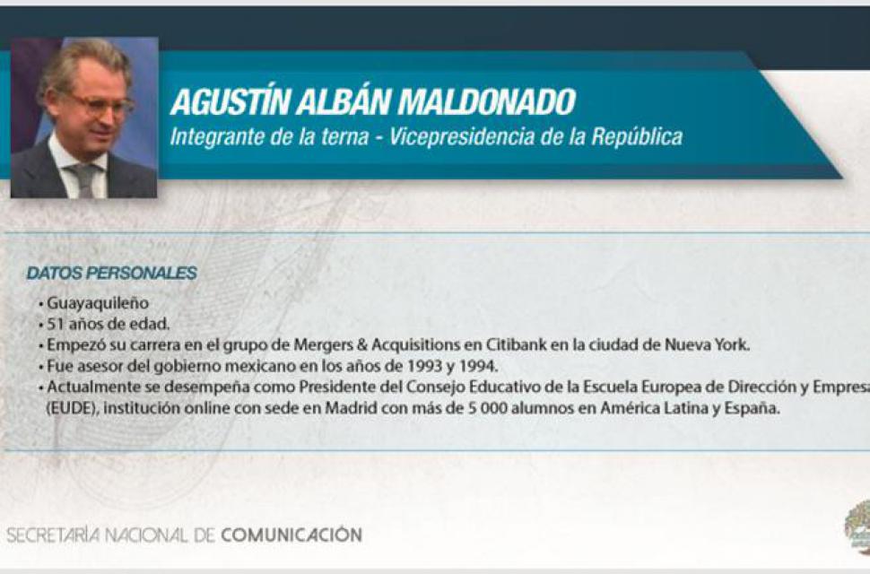 El radiodifusor Otto Sonnenholzner encabeza la terna para Vicepresidente del Ecuador y la completa Nancy Vasco de Maldonado, de la Fundación El Triángulo, y Agustín Albán, vinculado a la educación.