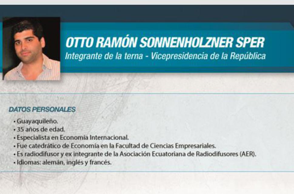 El Primer Mandatario dijo que Otto Sonnenholzner se desempeña como periodista. El candidato es un reconocido radiodifusor de Guayaquil. Ha sido presidente de la Asociación de Radiodifusión del Ecuador (AER) en Guayas. Tiene 35 años y un título de economista. Está casado y tiene tres hijos.