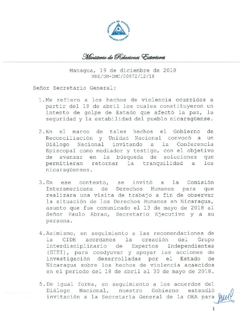 “Esta suspensión temporal de la CIDH, MESENI y Grupo Interdisciplinario de Expertos Independientes GIEI será hasta que se restablezcan las condiciones de respeto a la soberanía y cese la injerencia en los asuntos internos de Nicaragua”, explica la misiva.