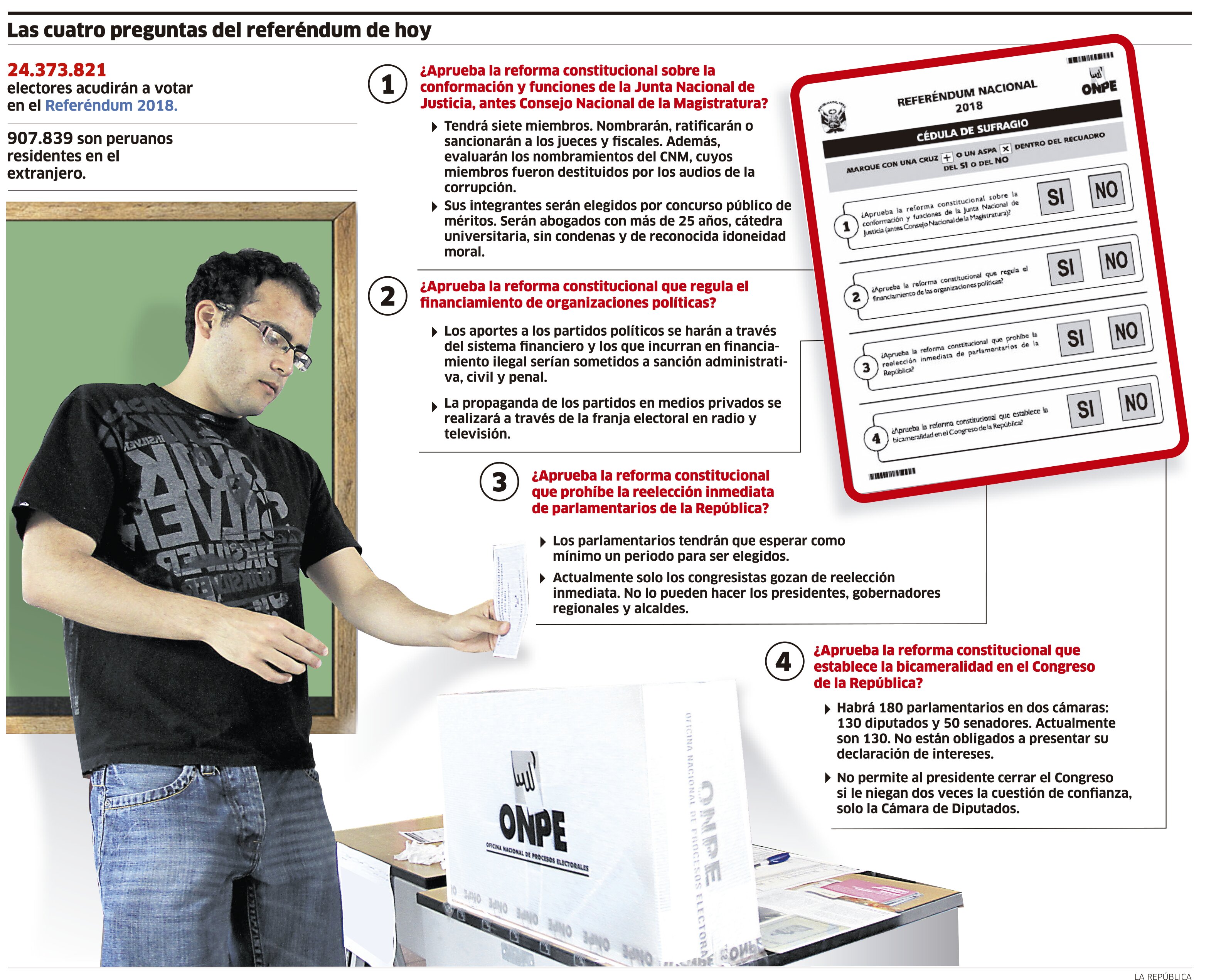 Más de 24 millones de peruanos acudirán hoy a las urnas para expresar su posición frente a las cuatro preguntas del referéndum 2018 en torno a la creación de la Junta Nacional de Justicia que elija jueces y fiscales, el financiamiento de partidos políticos, la no reelección inmediata de congresistas y el retorno a la bicameralidad.