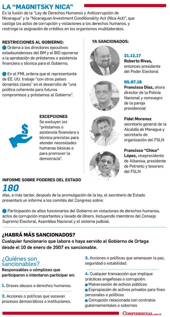 La Nica Act fusionada con las enmiendas de los senadores Ted Cruz, Bob Menéndez y Marco Rubio establece no solo el condicionamiento de préstamos para Nicaragua en organismos multilaterales, sino que impondrá sanciones a funcionarios y exfuncionarios del régimen Ortega Murillo involucrados en violaciones a los derechos humanos, actos de corrupción, socavamiento de las instituciones democráticas, expropiación de bienes públicos o privados, y arresto o enjuiciamiento de ciudadanos de forma ilegal.