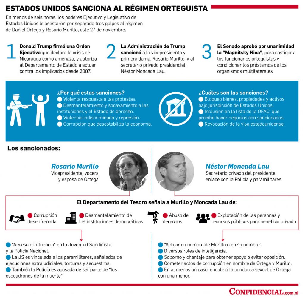 El 27 de noviembre el Gobierno de Estados Unidos sancionó a la vicepresidenta Rosario Murillo y al colaborador más cercano de la pareja presidencial, Néstor Moncada Lau, incluyéndolos en la lista de la Oficina de Control de Bienes Extranjeros (OFAC, por sus siglas en inglés). Al mismo tiempo, el presidente Trump, consideró la crisis en Nicaragua como “una extraordinaria e inusual amenaza para la seguridad nacional”.