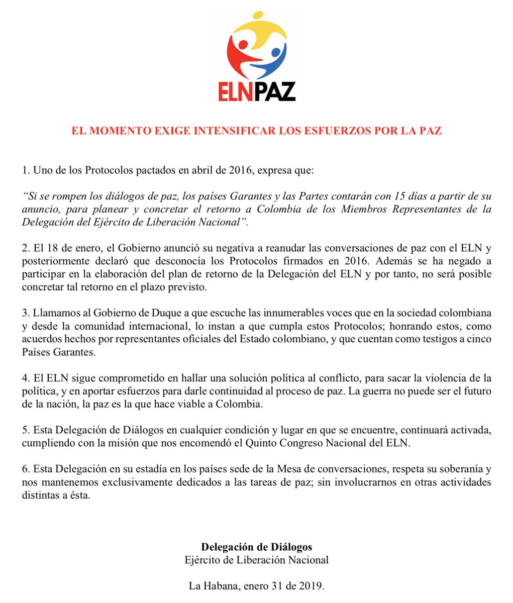 A pesar que han intentado entrar en contacto con el Gobierno no ha sido posible elaborar el plan de retorno de la delegación del ELN. También anuncian que siguen comprometidos con seguir buscando una solución política al conflicto y darle continuidad al proceso de paz.