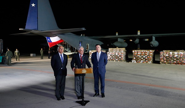 Piñera destacó que el avión que parte esta noche lleva casi nueve toneladas de kits de higiene para niños, medicamentos y alimentos «que van a ser de gran ayuda».