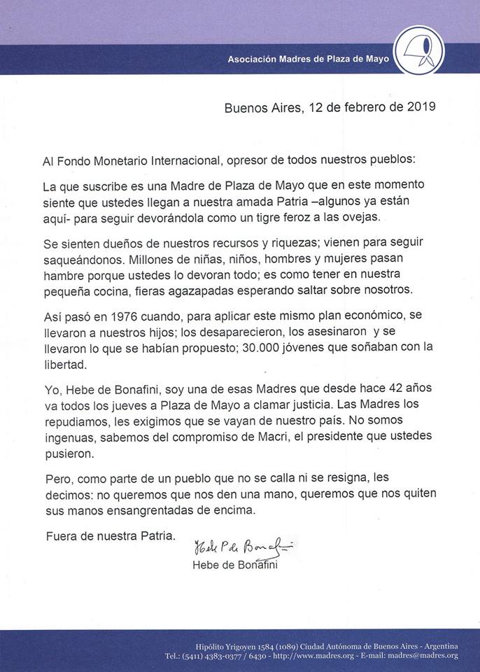 Carta de Hebe de Bonafini al FMI
