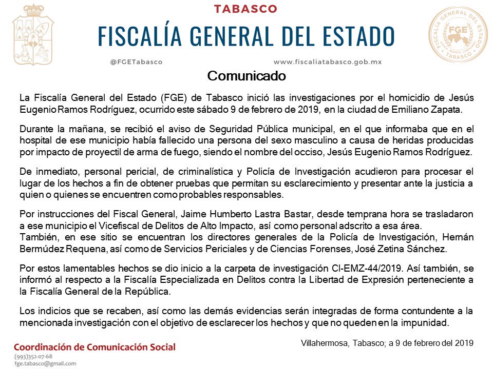 El gobernador de Tabasco, Adán Augusto López Hernández, dijo que personal de la Fiscalía del estado ya realiza las investigaciones correspondientes para dar con los responsables del homicidio del comunicador.