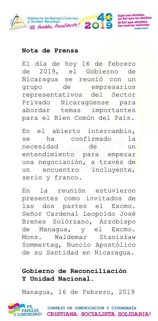 En un comunicado, el gobierno indicó que la reunión de este sábado se dio con «un grupo de empresarios representativos del sector privado», en el cual también estuvieron el cardenal Leopoldo Brenes y el nuncio, Waldemar Stanislaw Sommertag.