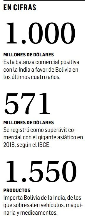 En los últimos cuatro años, Bolivia registró una balanza comercial positiva con India acumulada en más de $us 1.000 millones, según datos del IBCE. En 2018, se registró un superávit de más de $us 500 millones con la India.