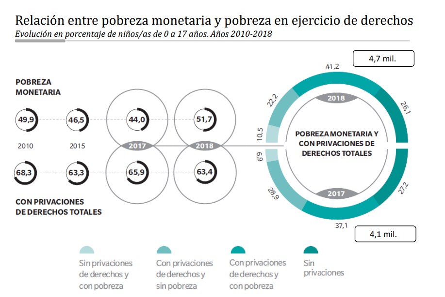 Cuando se analizan por separado la pobreza por ingresos y las demás carencias, los porcentajes de población infantil afectada son mucho mayores: mientras el 51,7% de los niños, niñas y adolescentes (NNYA) viven en hogares carentes en términos monetarios, seis de cada diez (63,4%) está privado del ejercicio de al menos un derecho fundamental.