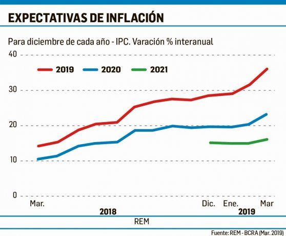 La aceleración del dólar de las últimas semanas, a partir de la mayor presión cambiaria, y los diversos aumentos de tarifas (aplicados y/o anunciados) generaron un fuerte incremento en las expectativas para la inflación futura. De acuerdo con el Relevamiento de Expectativas de Mercado (REM) de marzo, publicado ayer por el Banco Central, la inflación esperada para los próximos doce meses se ubicó en 30,7%, 1,7 p.p. por encima del informe anterior, mientras que para 2019 se espera un aumento del costo de vida del 36% (+4,1 p.p.). Si bien el aumento de precios será menor que el de 2018 (47,6%), el dato se encuentra lejos de lo que proyectaba el oficialismo para este año (28%) a comienzos de 2019. Por su parte, las proyecciones para el componente núcleo aumentaron en 2,7 p.p. para los próximos doce meses al 29,9%, de modo que terminaría el año en 35,1% (+5 p.p.).