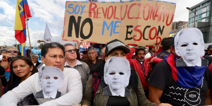 Con máscaras de anónymus, decenas de jóvenes marchan en contra de la decisión del Presidente Moreno de retirar el asilo diplomático a Julian Assange y su posterior detención por parte de las autoridades británicas. “Es lamentable lo que pasó con Asssange. Quien denuncia la verdad, lo meten preso y lo tratan como criminal. Es totalmente injusto”, criticó otro manifestante.