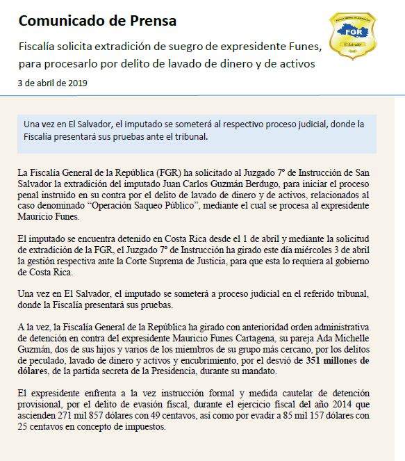 Por su parte, la Fiscalía General de la República (FGR) informó por medio de un comunicado que ha pedido formalmente tanto al Juzgado de Instrucción como a la Corte Suprema de Justicia (CSJ) la extradición del imputado.