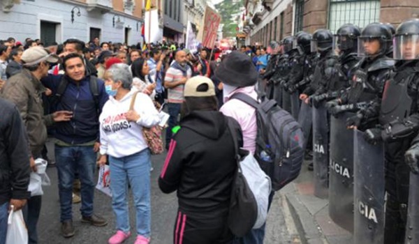 Llegada la marcha a ese lugar, hubo represión por parte de la fuerza pública. Lanzaron varias bombas lacrimógenas que dispersaron la protesta, pero afectaron a varios transeúntes que no participaban en la marcha, según denunciaron los representantes del bloque aliado al expresidente Rafael Correa.