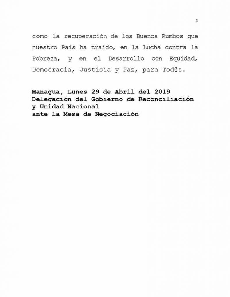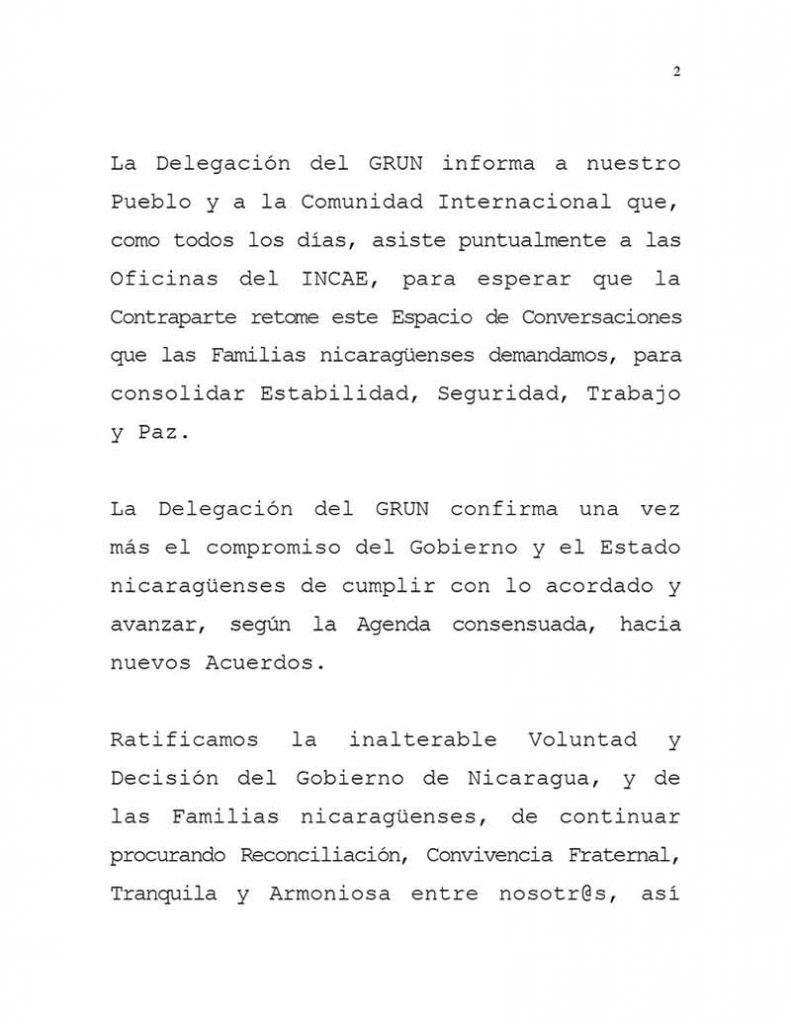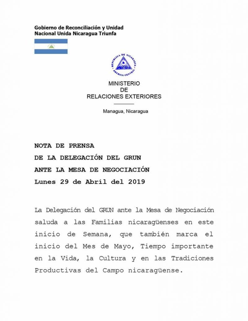 En una nueva nota de prensa emitida este lunes el Gobierno Sandinista ratifica una vez más el compromiso del estado nicaragüenses de cumplir con lo acordado y avanzar según la agenda consensuada, hacia nuevos acuerdos.
