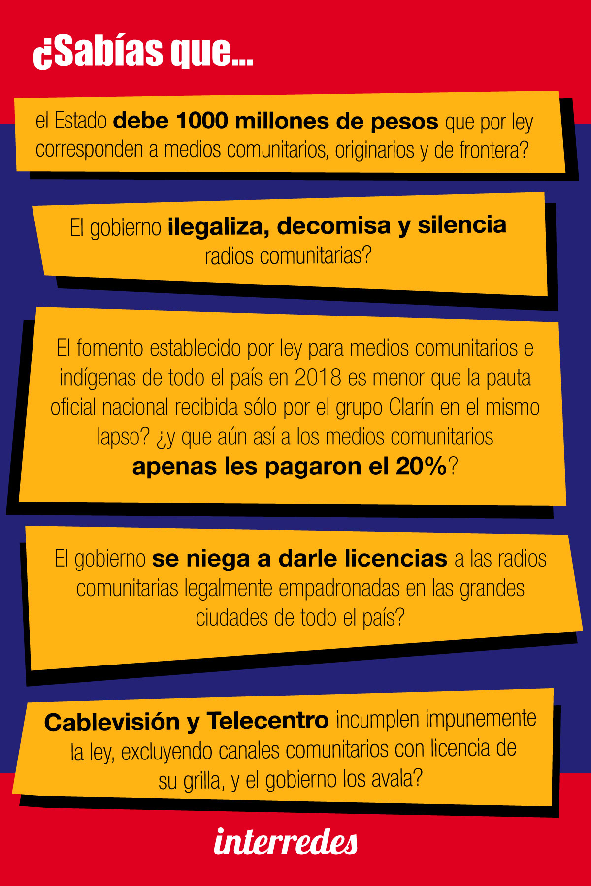 Las redes de medios comunitarios, nucleadas en el espacio Interredes, vienen señalando que el Estado acumula con el sector una deuda de mil millones de pesos, que corresponden al Fondo de Fomento Concursable (FOMECA), establecido en la Ley 26.522 aún vigente.
