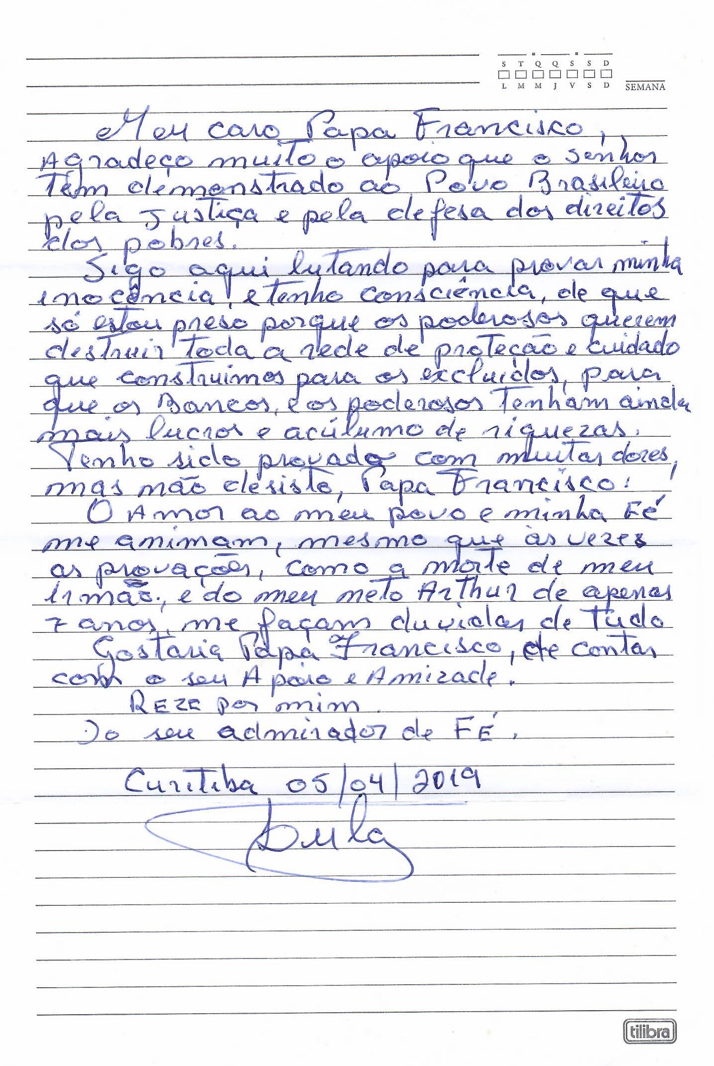 «Não deixe de rezar por mim», pede Francisco a Lula, dizendo que também ora pelo líder brasileiro. De acordo com Mônica Bergamo, «a correspondência é uma resposta a uma carta que o ex-presidente enviou ao santo padre em março».