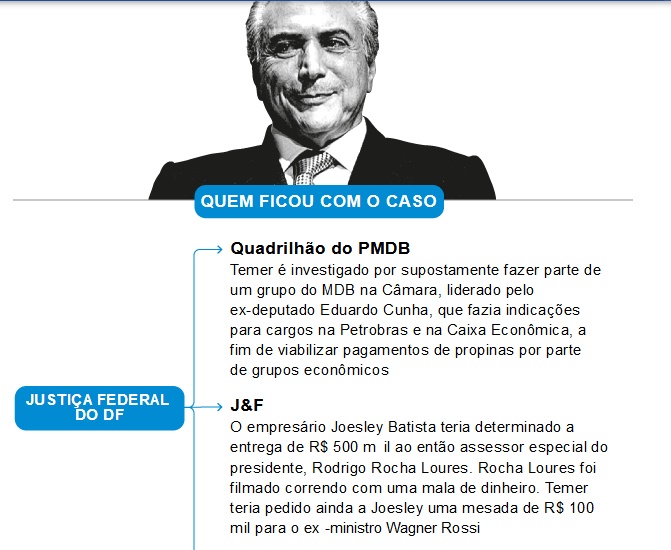 Duas vezes denunciado pela Procuradoria-Geral da República (PGR) quando ainda era presidente, Michel Temer (MDB-SP) é investigado em dez casos: três na Justiça Federal do Distrito Federal, três na Justiça Federal de São Paulo, um a Justiça eleitoral de São Paulo e outro na Justiça Federal do Rio, no qual foi determinada a prisão de quinta-feira pelo juiz federal Marcelo Bretas.