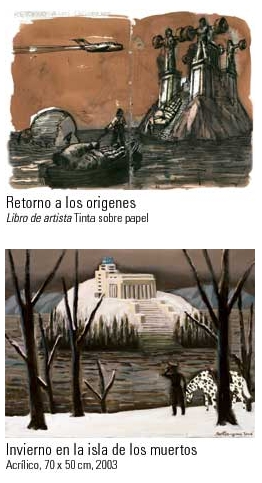 Hay una pintura que juega de una manera enigmática y contrastante con este universo: La isla de los muertos. Sobre la estructura del conocido cuadro de Arnold Böcklin, Santoro presenta el edificio de la CGT, mientras que del agua, en la que circula la barca de Caronte llevando el alma de los muertos, emerge, aunque casi hundida, la cabeza de Eva. La CGT está en la isla de los muertos… Eva hundida en el Leteo, el río del olvido que los muertos atraviesan. Como si la fuerza espontánea de la vida del pueblo (Eva) fuera olvidada para tener acceso a la estructura del poder político.