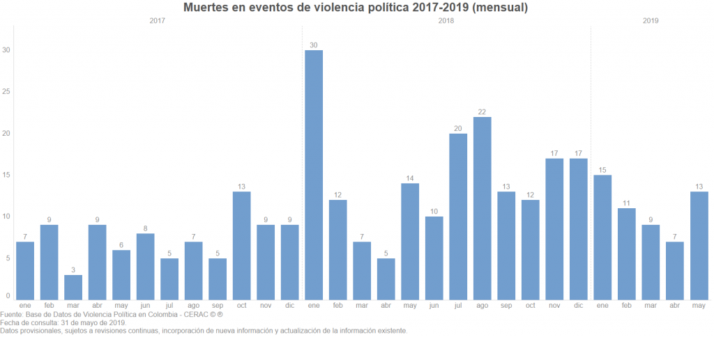 A pesar de que en mayo se registraron 23 días no consecutivos sin muertes asociadas a este tipo de violencia, el reporte indica que las 13 muertes de mayo representaron un aumento del 86 % frente a las presentadas en abril. Para Cerac, esta cifra impacta negativamente porque de enero a abril se registró una continua reducción.