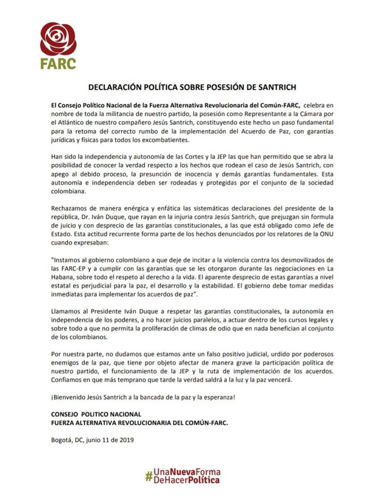 — FARC (@PartidoFARC) 11 de junio de 2019