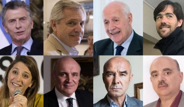 Los candidatos a presidente serán ocho: Mauricio Macri (Juntos por el Cambio), Alberto Fernández (Frente de Todos), Roberto Lavagna (Consenso Federal), Nicolás Del Caño (FIT), Manuela Castañeira (Nuevo MAS), José Luis Espert (Frente Despertar), Juan José Gómez Centurión (Frente Nos), Alejandro Biondini (Frente Patriota) y José Romero Feris (Partido Autonomista Nacional).