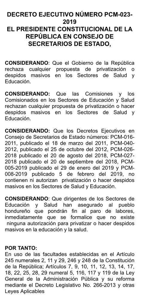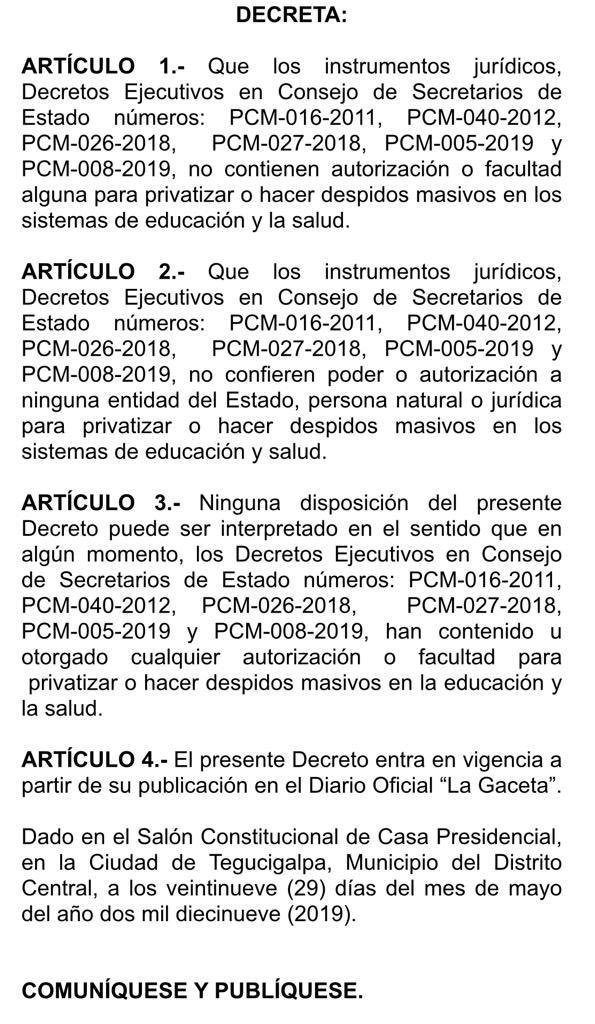 El gobierno de Honduras procedió la noche de este domingo a derogar los decretos ejecutivos de la salud y la educación y procedió a firmar un acuerdo con una facción del magisterio para la aprobación de dos decretos ejecutivos nuevos.