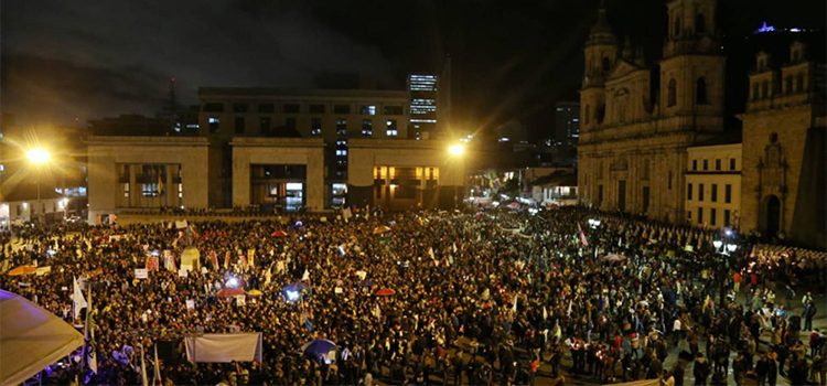 Mientras la marcha avanzaba, otra multitud de personas vestidas de blanco, con banderas de Colombia y mensajes de paz, esperaba en la plaza donde se realizaría un plantón para pedir cese a la violencia en el territorio nacional.