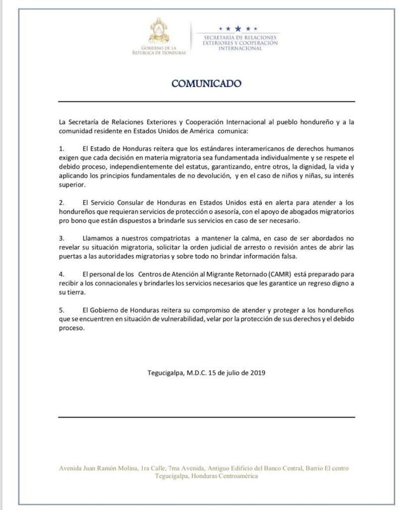 “El Servicio Consular de Honduras en Estados Unidos está en alerta para atender a los hondureños que requieran servicios de protección o asesoría, con el apoyo de abogados migratorios que están dispuestos a brindarles sus servicios en caso de ser necesario”, subraya el escrito.