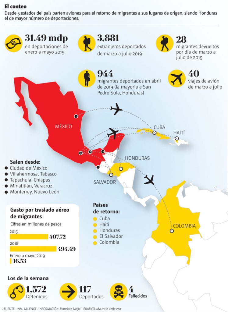 • Durante la semana del 8 al 14 de julio en al menos 14 entidades del país fueron detenidos mil 572 migrantes, 117 fueron retornados a sus países de origen y cuatro más fallecieron.
