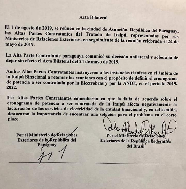 «La Alta Parte Contratante Paraguaya comunicó su decisión unilateral y soberana de dejar sin efecto el Acta Bilateral del 24 de mayo de 2019. Ambas altas partes contratantes instruyeron a las instancias técnicas en el ámbito de la Itaipú Binacional a retomar las reuniones con el propósito de definir el cronograma de potencia a ser contratada por la Eletrobras y la ANDE en el periodo 20419-2022.