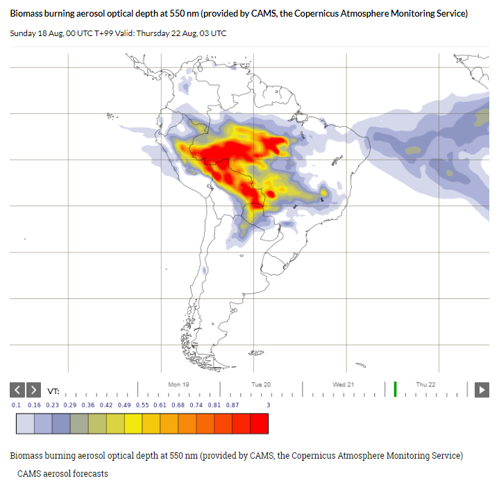 Profundidad óptica de aerosol de quema de biomasa a 550 nm (proporcionado por CAMS, el Servicio de Monitoreo de Atmósfera de Copérnico). 18/8/2019