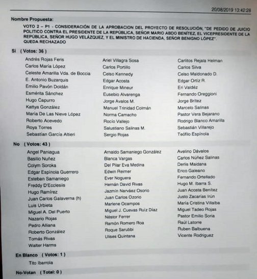 La Cámara de Diputados rechazó definitivamente este martes el pedido de juicio político al presidente de la República, Mario Abdo Benítez, y el vicepresidente Hugo Velázquez, por la firma del acta bilateral sobre Itaipu. Con 43 votos en contra, los colorados archivaron la intención de la oposición de sacar a ambos de sus cargos, además de Benigno López, ministro de Hacienda.