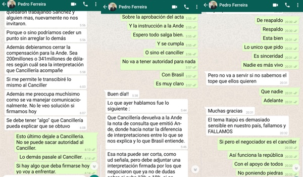 Recordemos que, en una comunicación vía WhatsApp, entre Abdo Benítez y Pedro Ferreira, en ese momento presidente de la ANDE, este en todo momento le afirma que no es conveniente aceptar la propuesta del Brasil porque sería perjudicial para el Paraguay. Sin embargo, el jefe de Estado le insiste que se debe firmar el contrato y luego ver cómo resolver la cuestión.