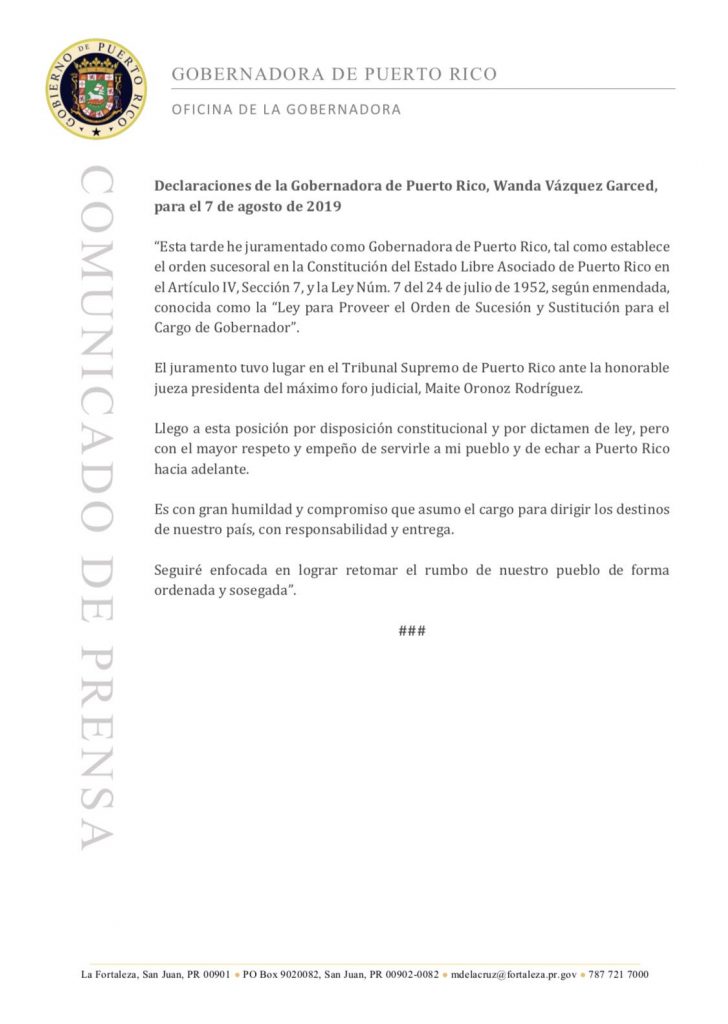 «Llego a esta posición por disposición constitucional y por dictamen de ley, pero con el mayor respeto y empeño de servirle a mi pueblo y de echar a Puerto Rico hacia adelante», agregó en su comunicado de prensa.