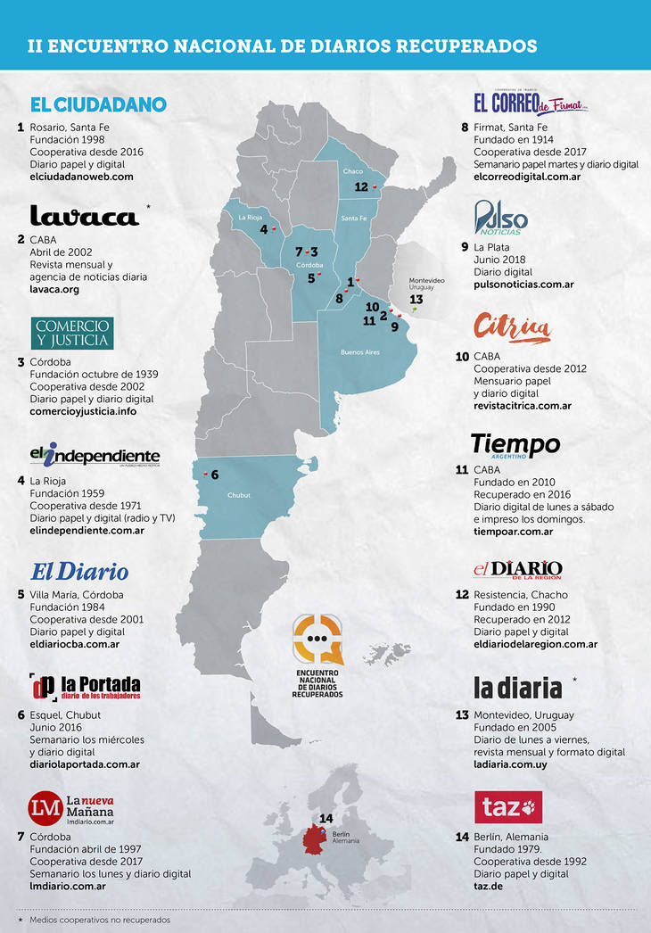 Los diarios recuperados viajaron desde Córdoba (Comercio y Justicia, La Nueva Mañana y El Diario del Centro del País), Chaco (El diario de la Región), Buenos Aires (Pulso), la Capital Federal (Tiempo y Cítrica) y Santa Fe (Firmat). Por motivos de fuerza mayor no pudieron participar esta vez La Portada de Esquel y El Independiente de La Rioja, que igual integran la Red Nacional de Diarios Recuperados.