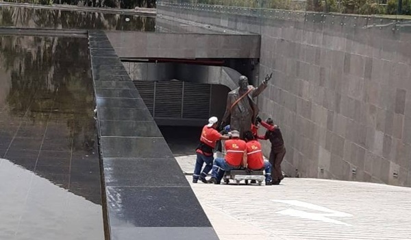 La base de la estatua fue tapada con un plástico negro y hasta ahora no se sabe el destino de la misma, pues fue una donación del gobierno argentino en la presidencia de Cristina Fernández, esposa del fallecido Kirchner; tuvo un costo aproximado de 114 mil dólares, fue hecha en Buenos Aires por el escultor Miguel Gerónimo Villalba.