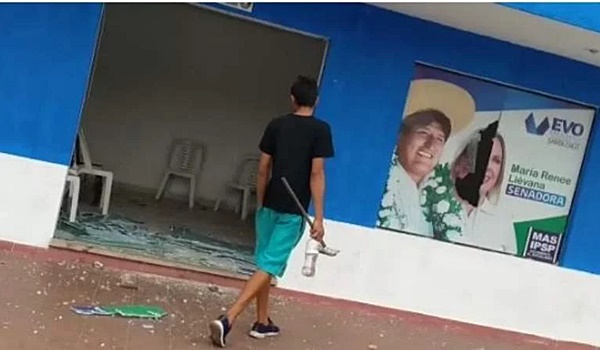 No fue suficiente la fuerza policial y la turba logró entrar. “Rompieron puertas, ventanas, se llevaron todo el material que había, se llevaron computadoras, saquearon la casa”, relató la candidata a senadora del MAS María Renée Liévana, quien dijo que estaba cerca del lugar de la violencia y que el vehículo en el que viajaba fue atacado y le rompieron el parabrisas.