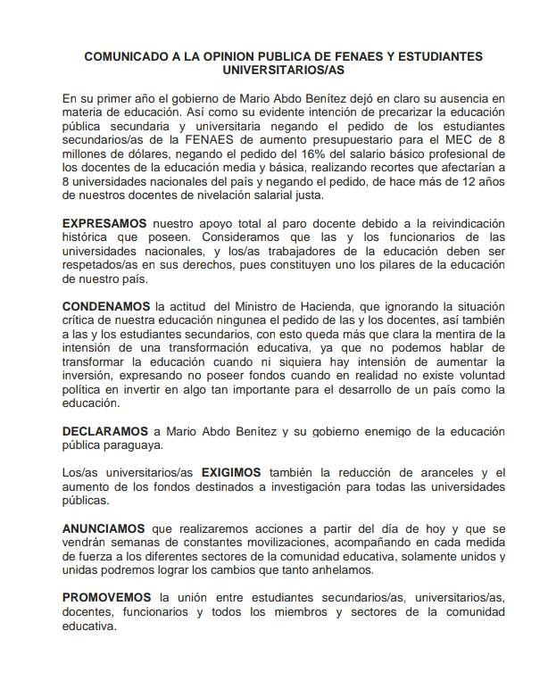 La Federación Nacional de Estudiantes Secundarios (Fenaes) y los universitarios emitieron un comunicado para expresar su apoyo al paro docente de la Universidad Nacional de Asunción (UNA), debido a la reivindicación histórica que poseen en cuanto a nivelación de salarios.