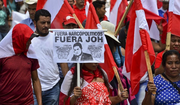 Cerca de 5.000 manifestantes, ondeando banderas rojo y blanco del Partido Liberal (PL, derecha), gritaban “Fuera JOH (iniciales del presidente), fuera narcodictador”.