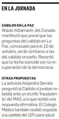 Para el 10 de octubre, el Comité Nacional de Defensa de la Democracia (Conade) convocó a realizar cabildos en todas las ciudades, el principal de los actos se realizará en La Paz.