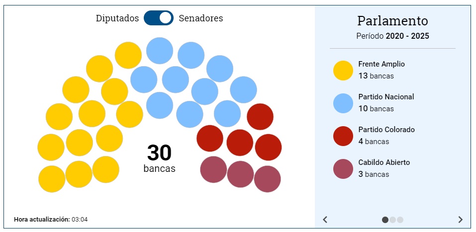En la Cámara de Senadores, el Frente Amplio lograría 13 bancas, el Partido Nacional 10, el Partido Colorado cuatro y Cabildo Abierto tres bancas.