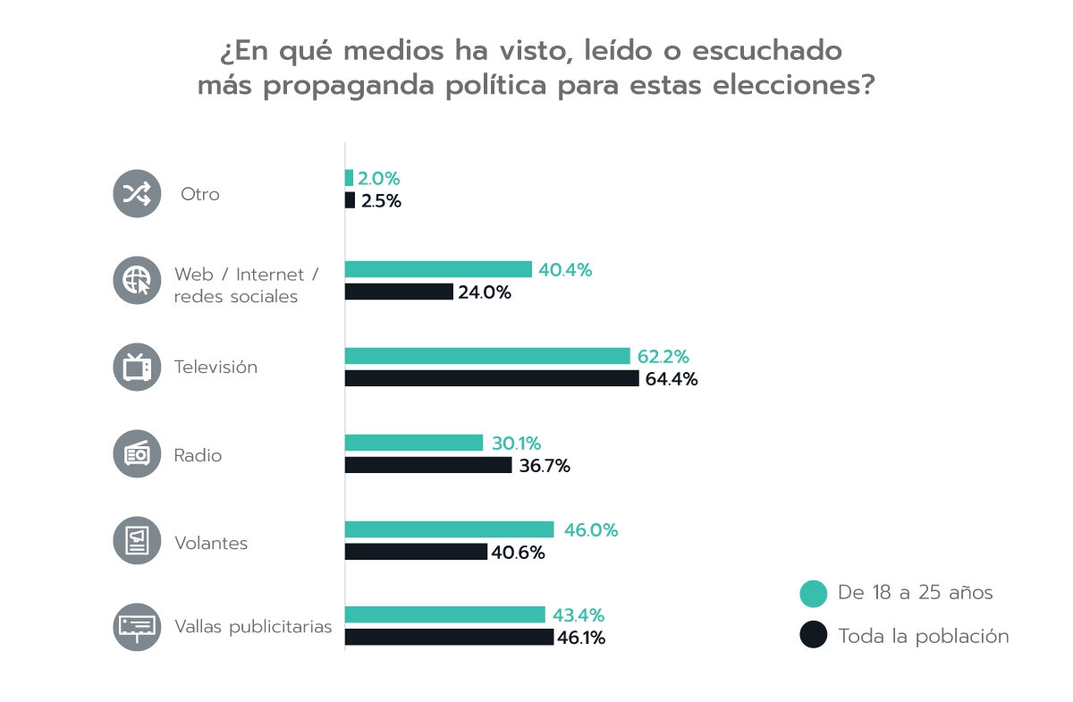 En esa última cifra juega un papel la edad de la persona consultada. Mientras la generalidad del consumo de información política sigue dándose en dos terceras partes mediante la televisión, 40.4% de los jóvenes entre los 18 y los 25 años reciben información política a través de medios digitales y redes, dentro de las cuales se cuenta WhatsApp.