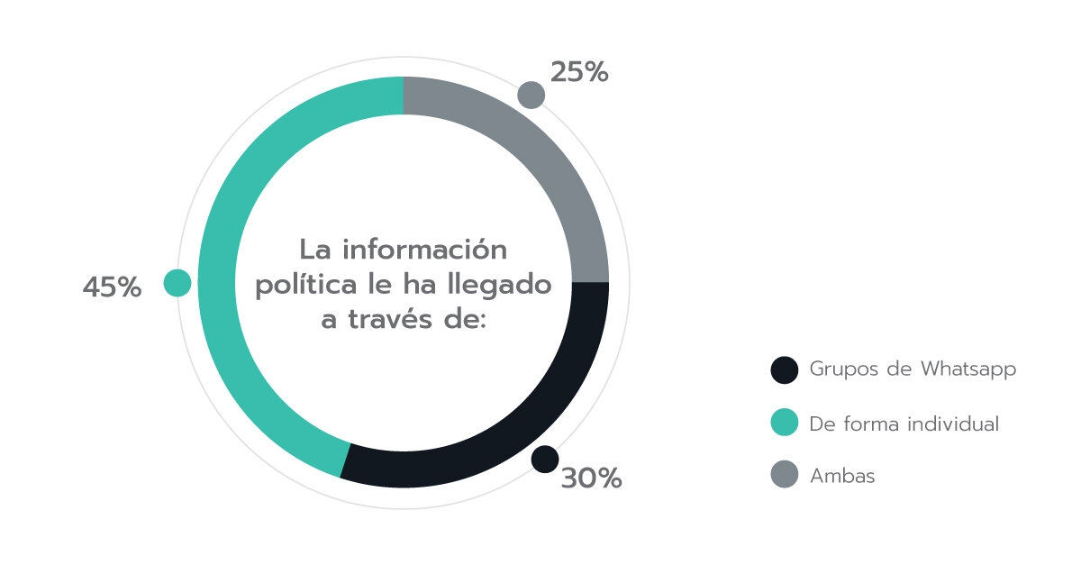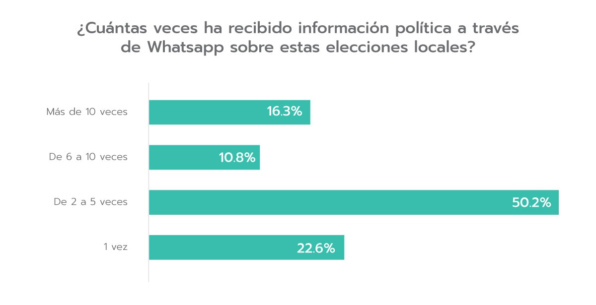 Quienes respondieron la encuesta dijeron que durante la presente elección recibieron mensajes de contenido político entre 2 y 5 veces, y un 45% dijo haberlos recibido de forma individual y no a través de grupos. Esto indica que WhatsApp parece no ser tan viral como suele pensarse. Los resultados marcan una diferencia frente al estudio que Linterna Verde había hecho de este tema en las elecciones presidenciales de 2018: los grupos y las cadenas parecen haber perdido fuerza.