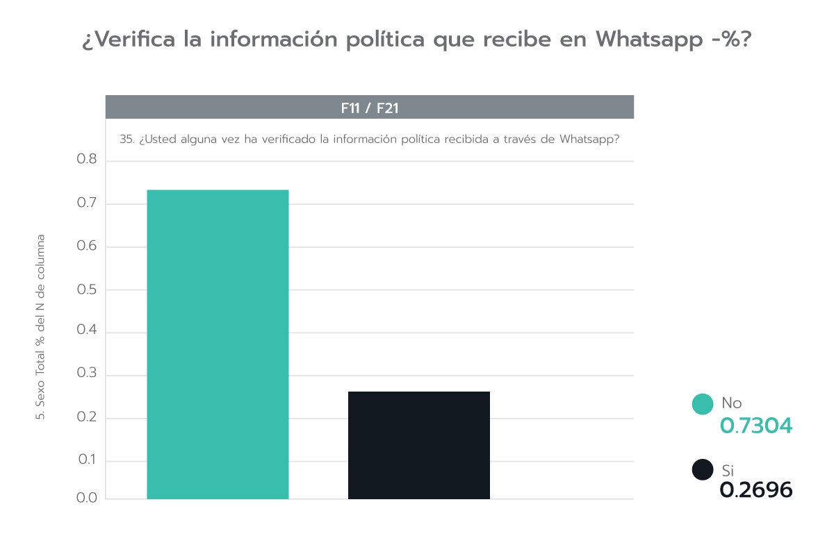 Tras analizar los datos recopilados, salta a la vista un hecho inquietante: estando a un poco más de dos semanas para el día de elecciones, un 73% de las personas que dicen haber recibido información de contenido político y electoral a través de Whatsapp, no corroboran la veracidad ni la validez de dicha información. Esto prende una alarma para esta última etapa de la campaña.